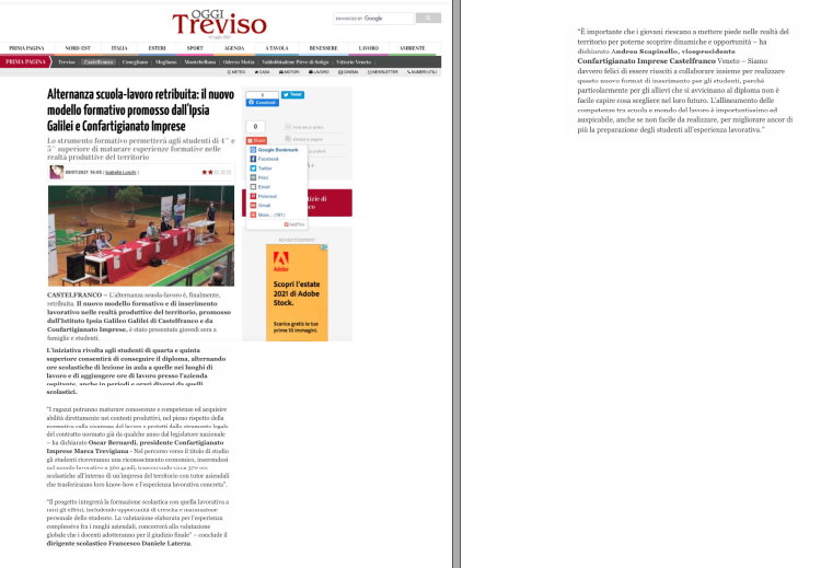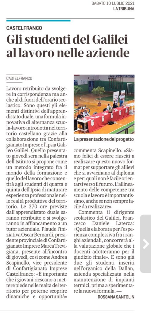 Alle famiglie e ai ragazzi del quarto anno che frequentano il percorso di studi Industria e Artigianato per il Made in Italy (a.s. 2021/2022), è stato riservato un incontro l’8 luglio presso la scuola Ipsia di Castelfranco Veneto, per valutare gli innovativi strumenti che consentono loro di lavorare come studenti/dipendenti e di maturare esperienze formative in azienda.
