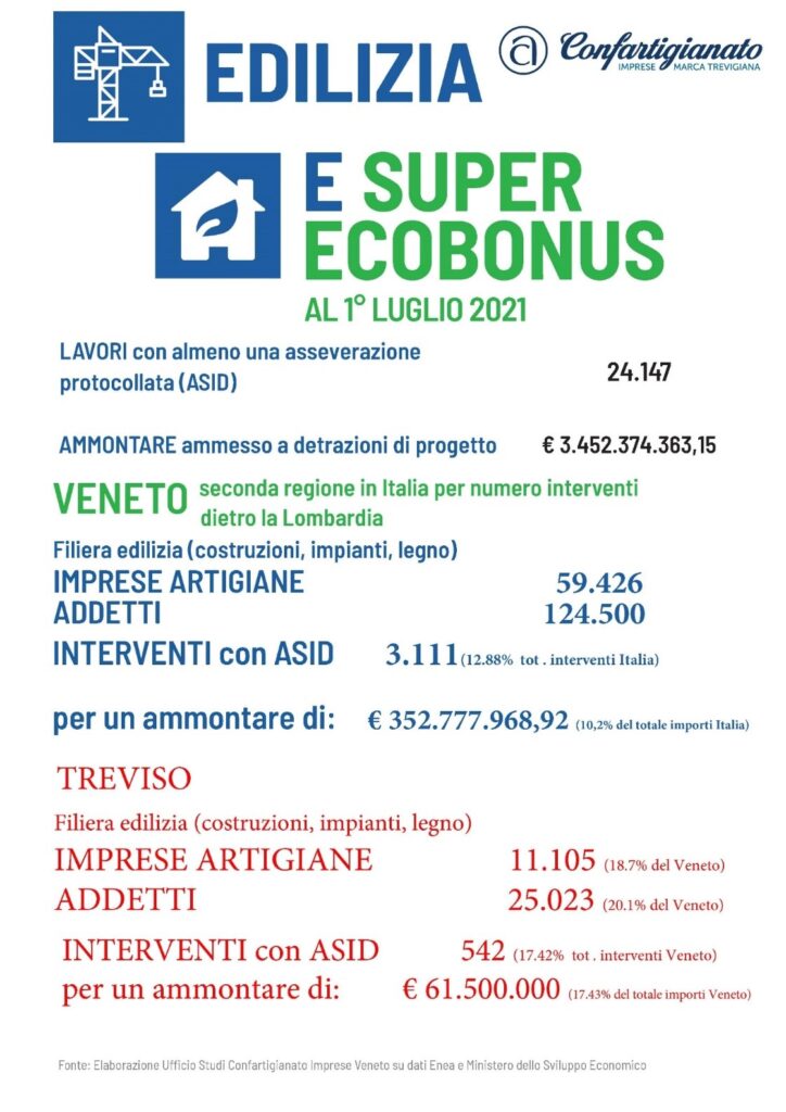 Le statistiche aggiornate al 1 luglio dell’ENEA sulla distribuzione territoriale degli interventi superbonus riportano che in soli due mesi (dal 21 aprile a fine giugno), in Italia si è registrato un vero boom di pratiche +122% (da 10.914 a 24.147) e dell’ammontare a detrazione +160% (da 1 miliardo 328 milioni a 3 miliardi 452 milioni). In questa classifica, il Veneto, è la seconda regione più ricettiva dopo la Lombardia con 3.111 interventi (il 13% del totale ed un importo di 353 milioni di euro).